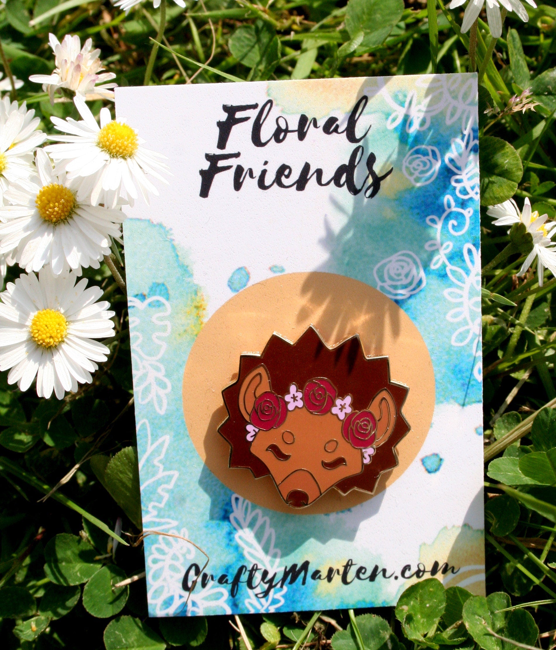 Hedgehog Enamel Pin Floral Friends Gold Hard Enamel Lapel Pin with Flower Crown Metal Pin Badge, Cute Wildlife Pin, Animal Lover Gift