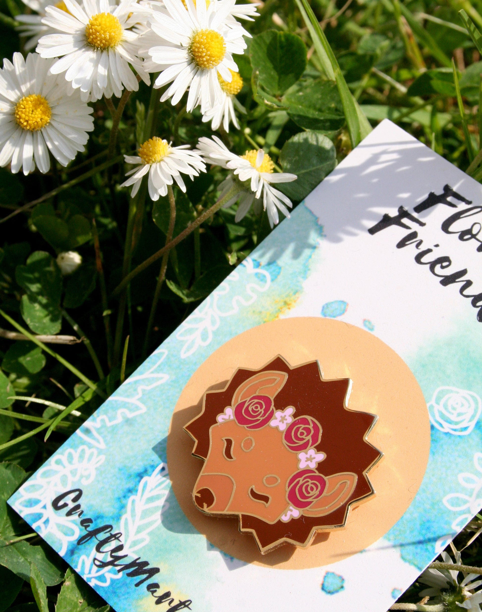 The pin features an adorable hedgehog wearing a delicate crown of flowers.