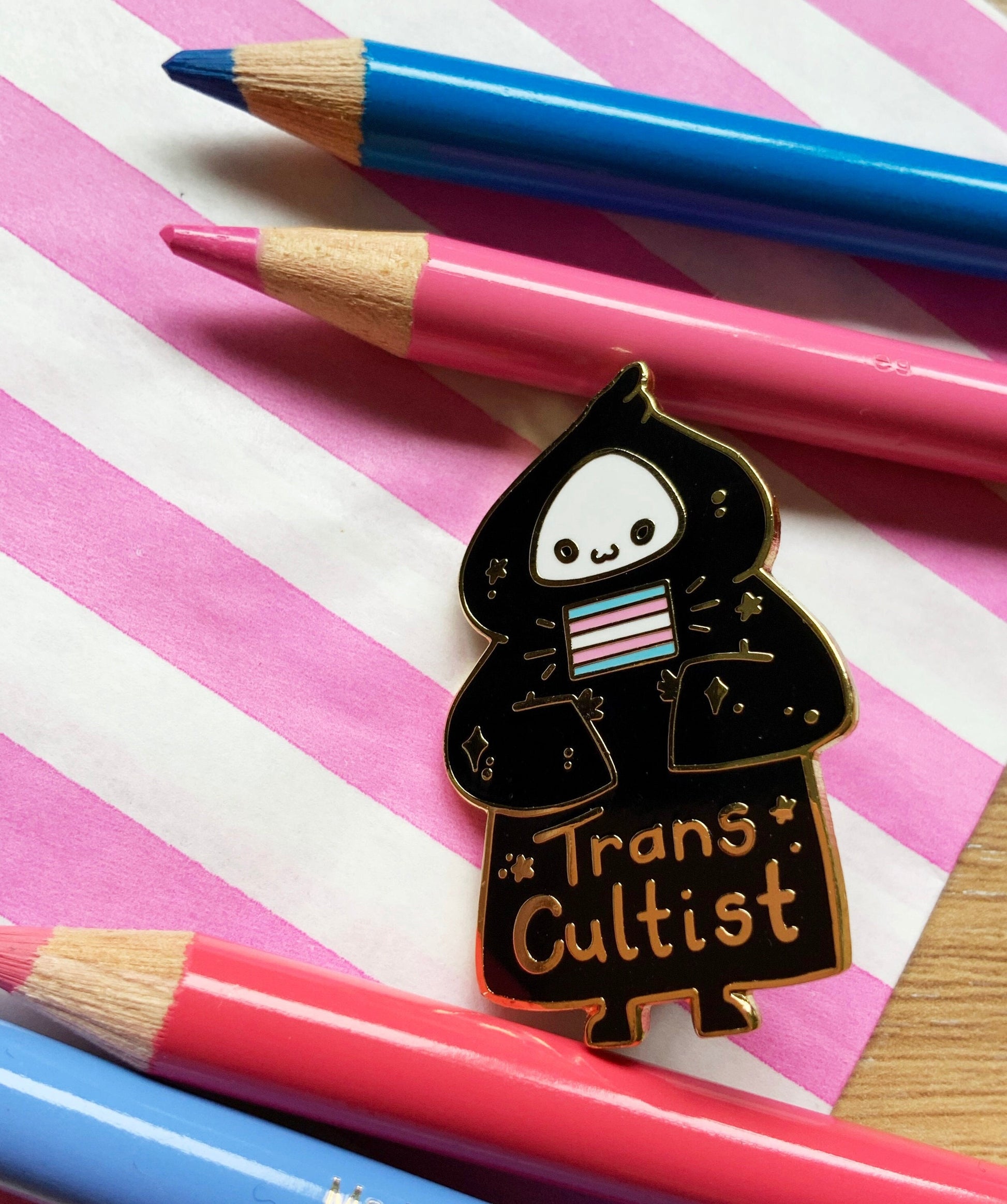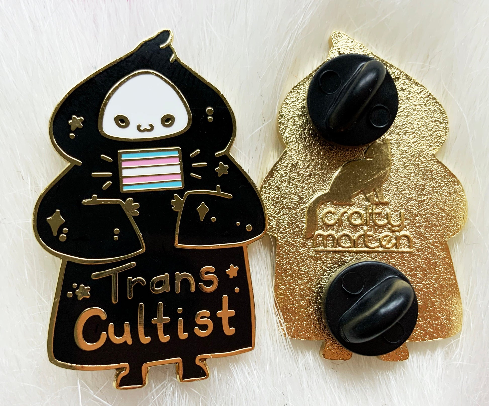 The pin features a black-robed figure holding a transgender pride flag with the text "Trans Cultist" below.