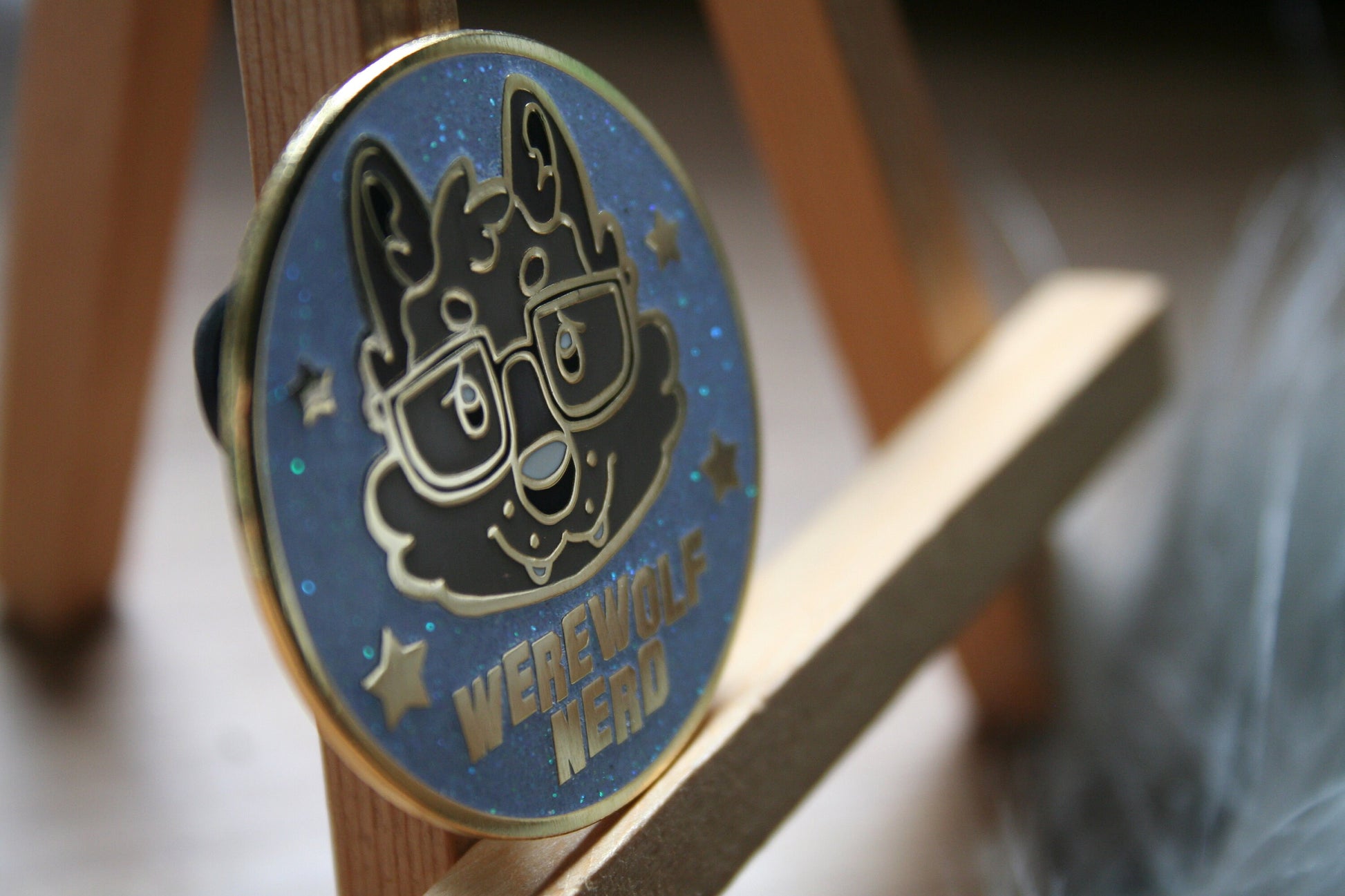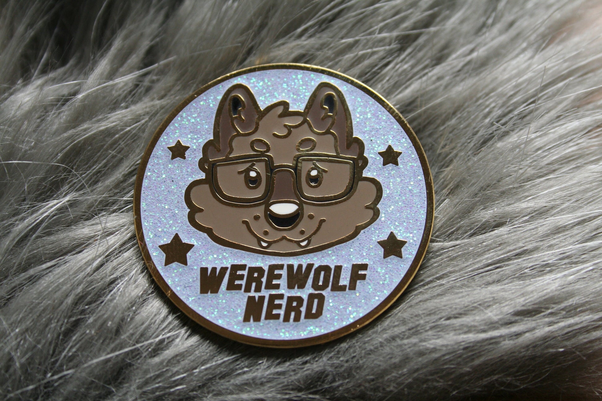 The pin features a fluffy wolf wearing glasses with the words "Werewolf Nerd" below.
